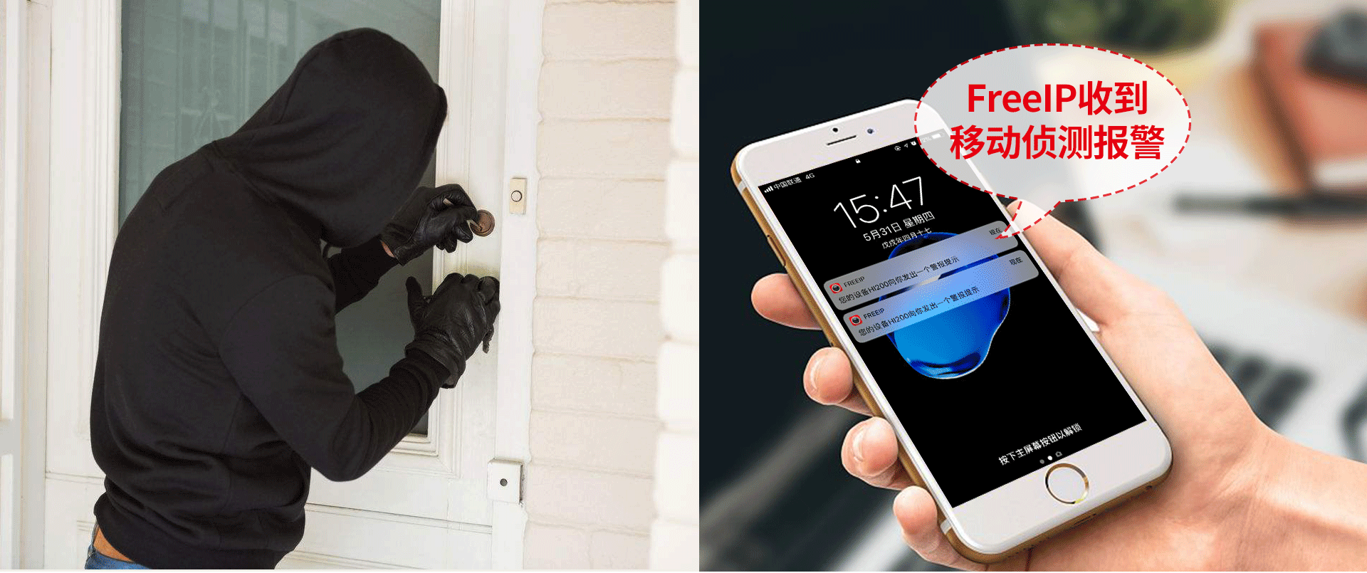 摄像机将开启录相,并实时推送报警信息至FREEIP软件上,